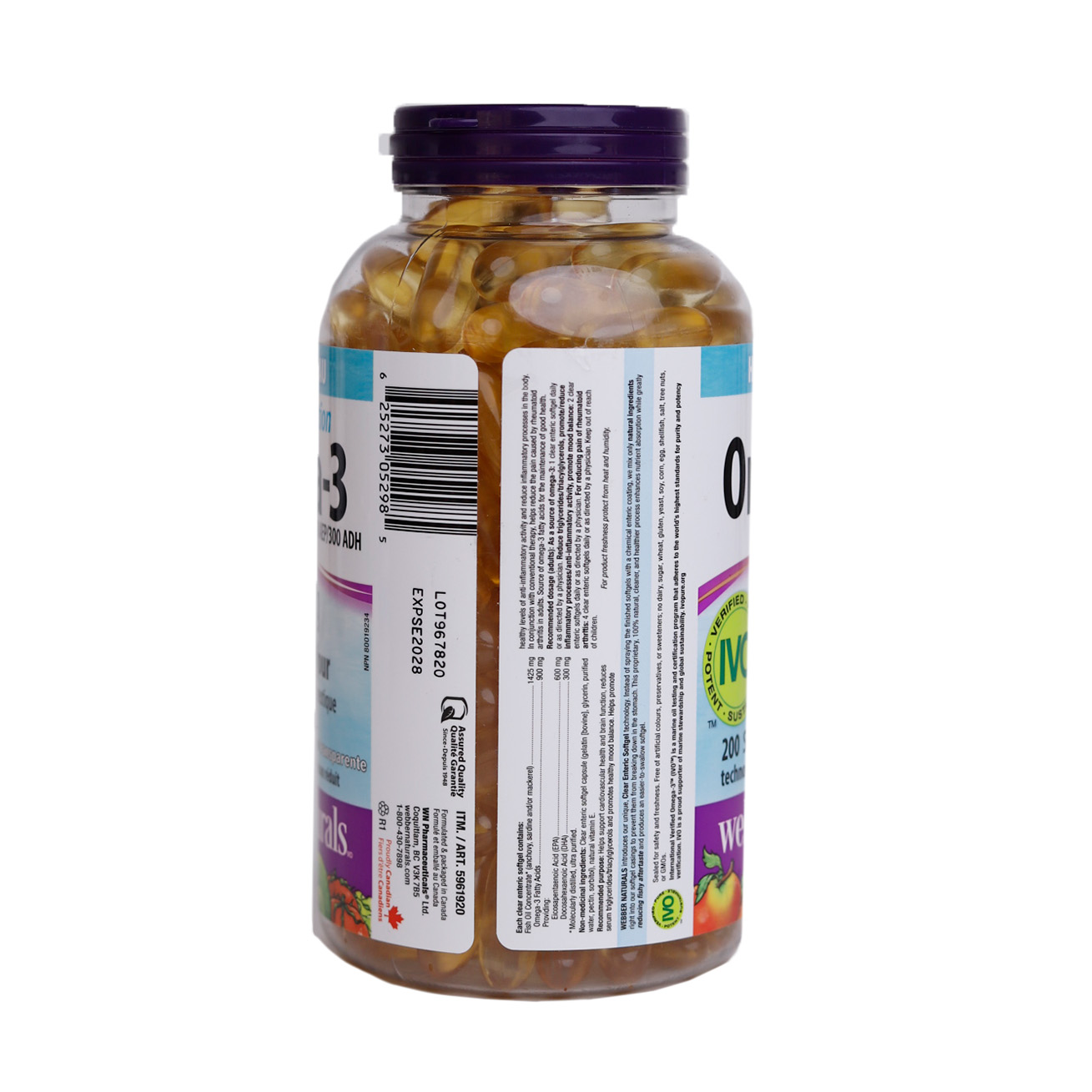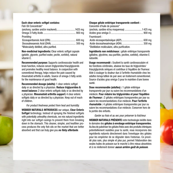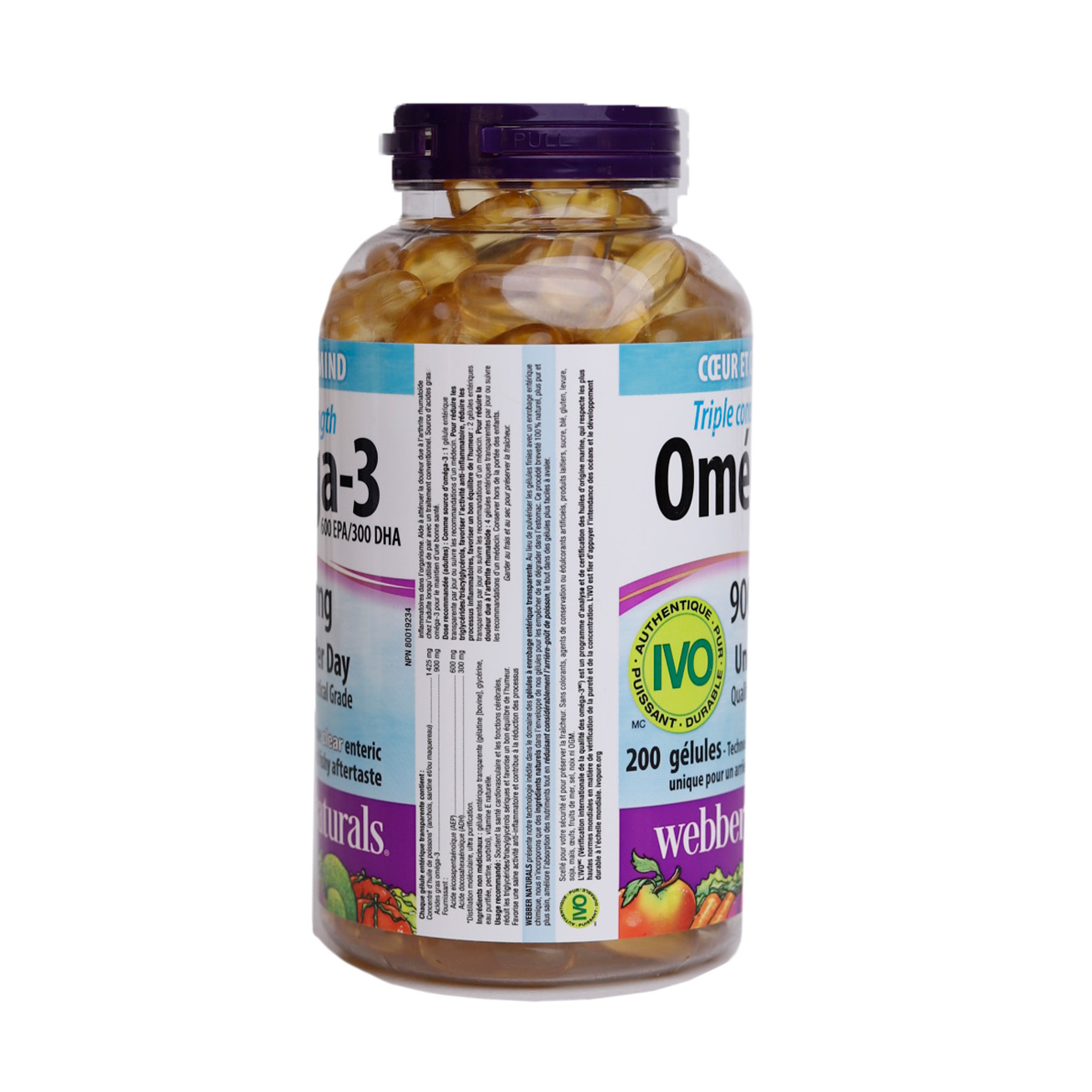 کمک به حمایت از سلامت قلب و عروق و عملکرد مغز، کاهش تری گلیسیرید و التهاب سرم و ارتقاء تعادل خلق و خوی سالم با امگا 3 با قدرت سه گانه. امگا 3 از Webber Naturals از روغن ماهی وحشی ساخته شده است.
