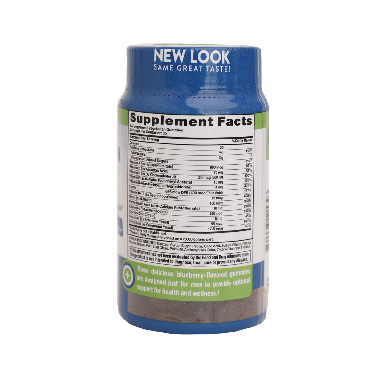 ویتامین A، ویتامین C، ویتامین D، ویتامین E، ویتامین B6، فولات، ویتامین B12، بیوتین، اسید پانتوتنیک، ید، روی، سلنیوم، کروم. سایر ترکیبات: شربت گلوکز، شکر، پکتین، اسید سیتریک، سیترات سدیم، طعم دهنده های طبیعی، رنگ آنتوسیانین، کولین بی تارترات، اینوزیتول و چند ماده دیگر.