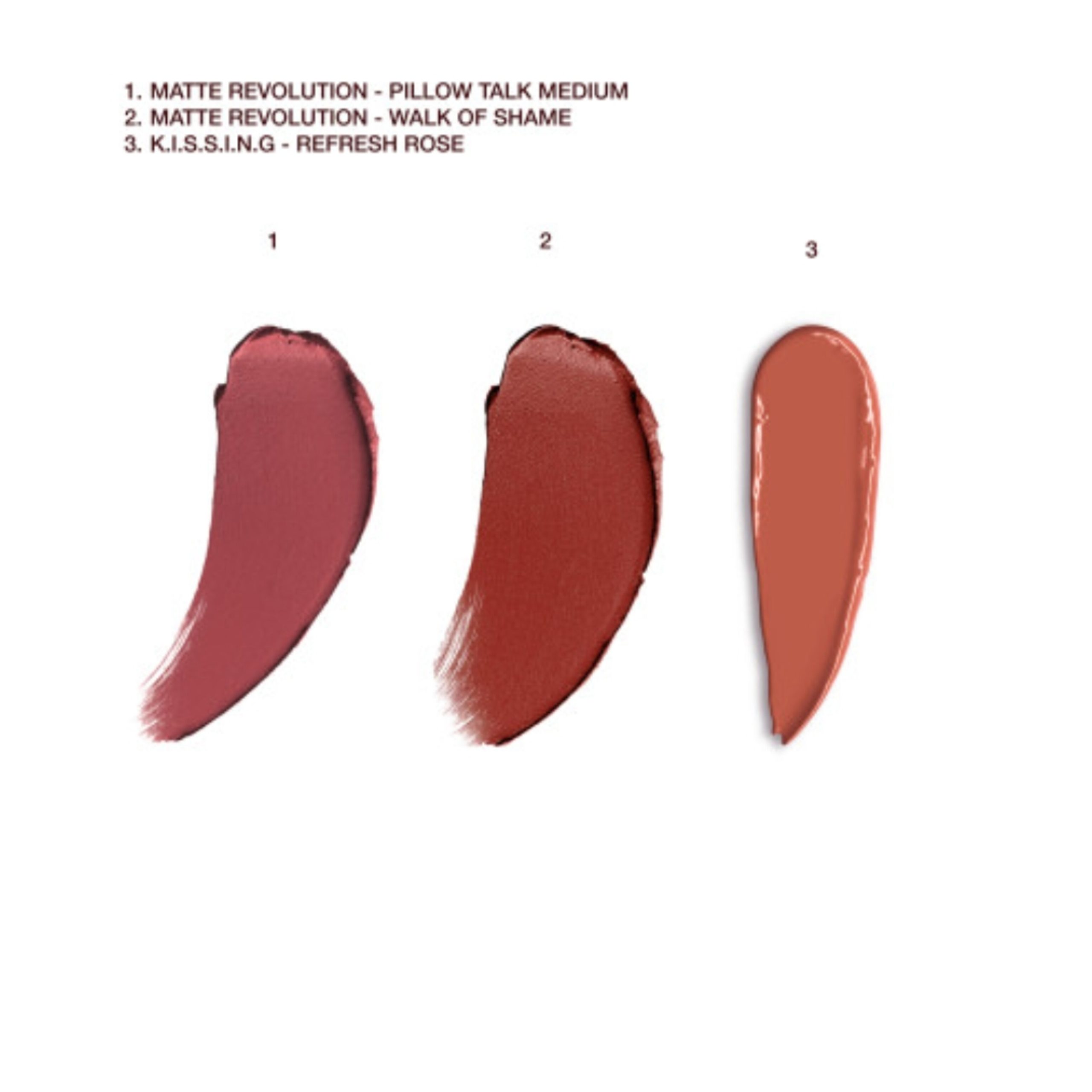 پک رژ لب شارلوت با سه رنگ pillow talk medium, walk of no shame, stoned rose شاز پرفروشترین و پرطرفدارترین رژ لب ها هستند که در سراسر جهان در بین میکاپ آرتیست های حرفه ای بسیار محبوب هستند ،این رژ لب ها با پیگمنت قوی و سه بعدی حجم دهنده عالی لبها هستند.نمای ساتنی و سه بعدی دارند.حاوی عصاره رز،شاتوت،عصاره درخت ارکیده،مرکبات ژاپنی و پاپایا هستند. آبرسانی بالایی دارند و با هیدراته کردن لبها باعث نرمی و لطافت لب ها برای ساعات طولانی میشوند،به هیچ عنوان لبها را خشک و یا پوسته نمیکنند و ماندگاری ۱۰ ساعته دارند.حاوی آنتی اکسیدان هستند ، کلاژن ساز و جوانساز لبهاهستند.بافت لبها را خشک ویا پوسته نمیکنند و به هیچ عنوان روی لب تکه تکه نمی شوند.پیگمنت قوی و ماندگاری بالا از مزایای این رژ لبهای لوکس و پرطرفدار است خصوصا که تکنولوژی سه بعدی و حجم دهنده لب نیز دارند و کاملا وگان تهیه شده اند.