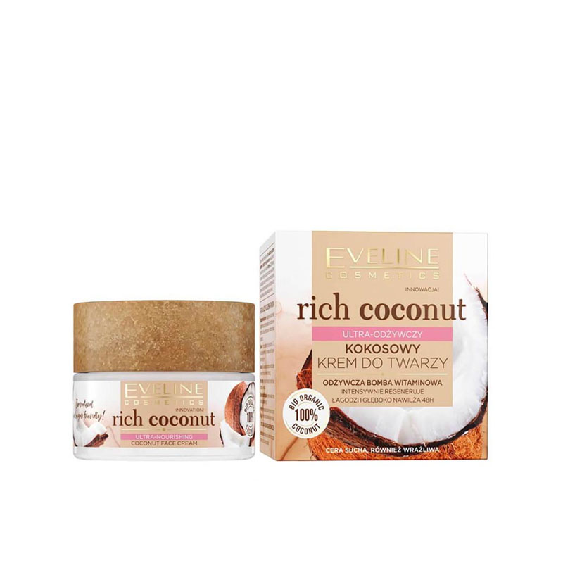 کرم مغذی و ویتامینه نارگیل اولاین Eveline Rich Coconut Nourishing دارای فرمول متشکل از مواد مغذی طبیعی و معجزه آسا است که تغذیه کامل پوست را فراهم می کند. کرم مغذی اولاین حاوی روغن نارگیل ارگانیک، آلوئه ورای ارگانیک با خواص آبرسانی و تسکین پوست، روغن بادام، عصاره گوجی بری و کره انبه است که مواد مغذی مورد نیاز پوست را تامین کرده و با علائم پیری و ایجاد چروک مقابله می کند. این ترکیب همچنین حاوی ویتامین های A، C، E و PP است که با نام بمب ویتامین شناخته می شوند و باعث افزایش روشنایی و شفافیت و محافظت پوست در برابر رادیکال های آزاد و عوامل آسیب رسان می شود. علاوه بر این باکتری های مفید پروبیوتیک جهت تقویت سد دفاعی پوست و ایجاد نمای جوان تر پوست به این فرمول اضافه شده و محصولی کامل را پدید آورده است.