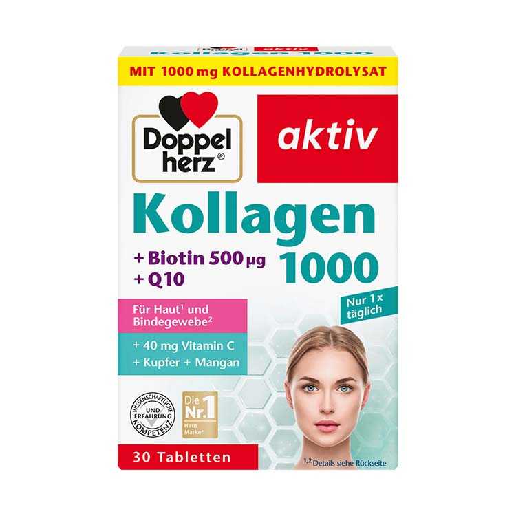 قرص کلاژن 1000 و کیوتن DoppelHerz ساخت کشور آلمان است و تعداد آن در هر بسته 30 عدد می باشد. در صورتی که به دنبال خرید مکمل پوست و مو خارجی با ترکیبات کامل به منظور تقویت پوست و پیشگیری یا درمان علائم پیری پوست خود هستید، این محصول شگفت انگیز به شما توصیه می شود.